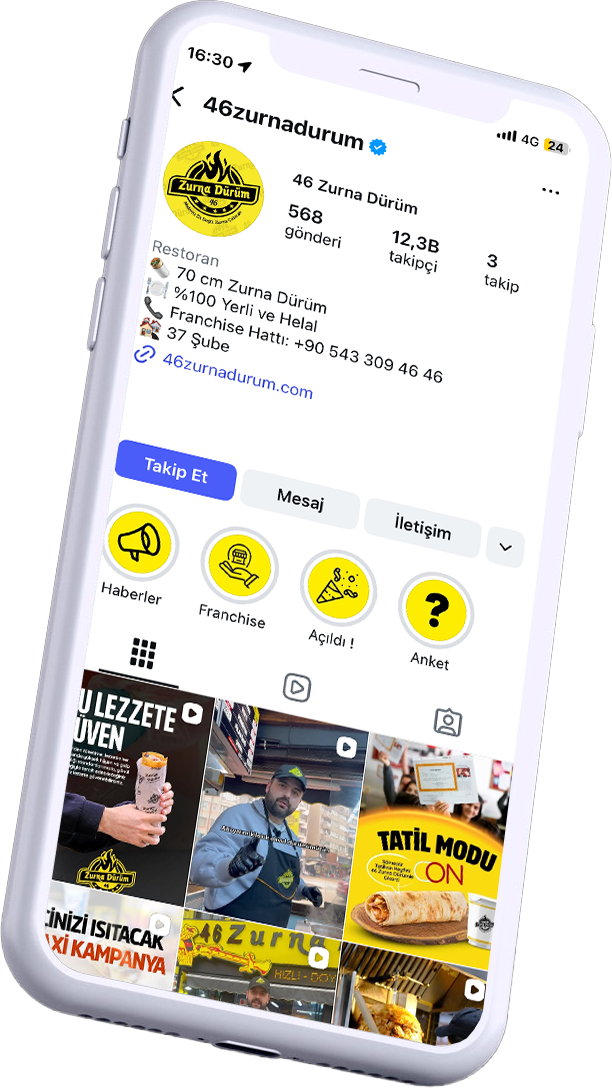 35 yıllık sektör tecrübesi ve titizlikle yürütülen AR-GE çalışmalarının ürünü olarak doğan 46 Zurna Dürüm, Türkiye’nin dört bir yanına yayılan profesyonel franchise sistemiyle güçlü bir marka hâline gelmiştir.